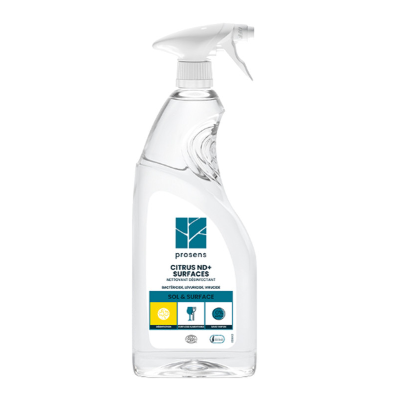 CITRUS ND+ SURFACES est un nettoyant bactéricide, fongicide (levuricide), virucide doté du label ECOCERT. La nouvelle formule de ce produit est exempte de parfums et colorants. Plus aucun allèrgène potentiel n'est présent dans ce produit. Il s'agit d'un produit très polyvalent utilisable notamment en cuisine (CONTACT ALIMENTAIRE) mais également pour l'entretien courant des sanitaires grâce à son pH acide de 2,6. Très efficace sur l'inox et les surfaces dont il préserve la brillance. Usage professionnel.